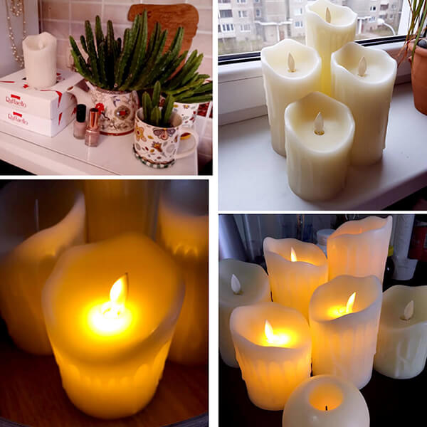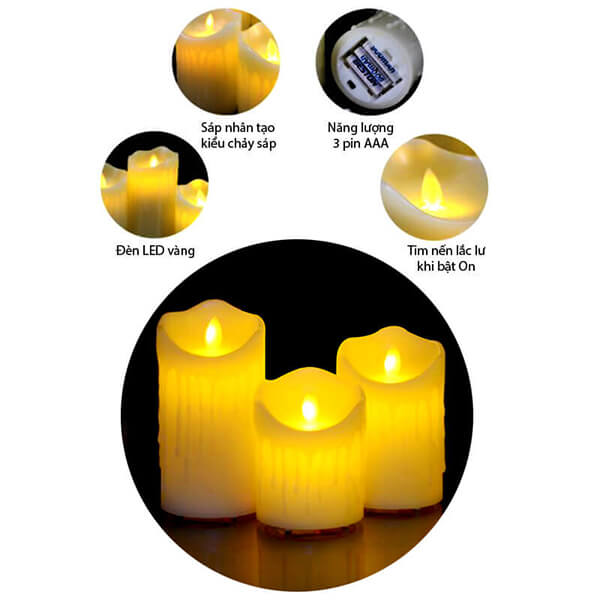 Phần vỏ ngoài của nến có thiết kế kiểu chảy sáp, khi bật sáng đèn nến có màu vàng và tim nến lắc lư y như ngọn nến thật đang cháy sáng và chảy sáp lem nhem. Điểm nổi trội của sản phẩm Bộ 3 nến điện tử vỏ sáp chảy là có khả năng thách thức mọi cơn gió thổi qua, không lo gió mạnh làm nến bị tắt, không sợ nến bị ngã gây cháy nổ.