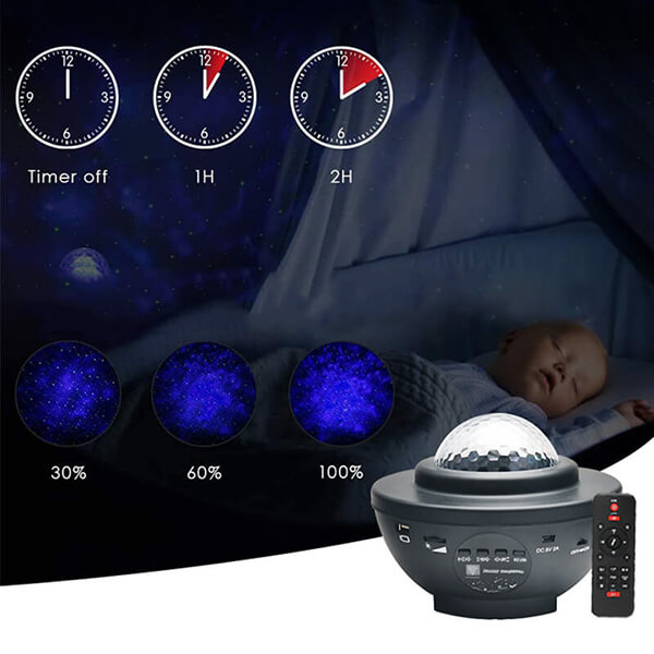 Đèn chiếu sao phát nhạc rất thông minh và hiện đại, có tích hợp bộ điều khiển từ xa và hẹn giờ: mọi thao tác điều chỉnh màu sắc đèn led, chọn các chế độ ánh sáng, tăng giảm âm lượng và độ sáng tối của đèn thật đơn giản và dễ dàng hơn với 1 chiếc Remote cầm trên tay. Bạn có thể đứng ở vị trí từ xa để chỉnh đèn bật/ tắt theo ý mình và việc trang bị thêm tính năng hẹn giờ tắt đèn tự động rất lý tưởng cho bạn khi sử dụng đèn để trang trí trong các bữa tiệc. Bạn chỉ cần dùng remote điều khiển từ xa, để tùy chỉnh hiệu ứng ánh sáng và mix nhạc, khi bữa tiệc kết thúc, đèn sẽ tự động tắt nếu bạn đã cài đặt sẵn chế độ hẹn giờ tắt sau 1 giờ/ 2 giờ sử dụng. Điều này giúp sản phẩm tiết kiệm năng lượng hơn và tiện lợi cho người dùng.