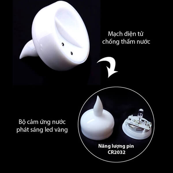 Nến có thiết kế nhỏ gọn, phần vỏ ngoài bằng nhựa bền bỉ, màu trắng sữa. Phần lõi bên trong có gắn mạch điện tử có tính năng cảm ứng nước để tạo ánh sáng led vàng rất độc đáo và mới lạ. Và việc sử dụng đèn led để tạo ánh sáng là một ý tưởng sáng tạo trong việc tiết kiệm chi phí mà hiệu quả đạt được lại hơn cả mong đợi.
