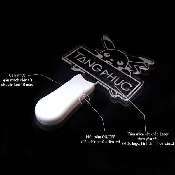 Lightstick 2D Tăng Phúc với chất liệu mica cao cấp, được cắt theo khuôn mẫu khách hàng yêu cầu, bề mặt trơn láng, trong suốt thích hợp khắc Lazer các file thiết kế (hình ảnh, logo, slowgan...) tạo nên những hình ảnh siêu đẹp, lung linh khi phát sáng. Phần cán bằng nhựa màu trắng bền chắc, vừa vặn tay cầm và bên trong có gắn một mạch điện tử với chế độ đèn Led đổi màu tùy ý bạn lựa chọn: chuyển led 15 màu, led màu hồng, xanh lá, xanh dương, vàng....