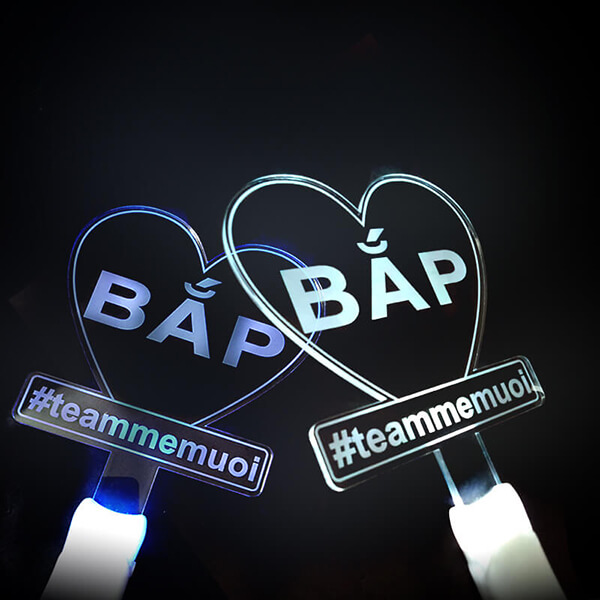 Với chất liệu mica cao cấp, được cắt theo khuôn mẫu khách hàng yêu cầu, bề mặt trơn láng, trong suốt thích hợp khắc Lazer các file thiết kế (hình ảnh, logo, slowgan...) tạo nên những hình ảnh siêu đẹp, lung linh khi phát sáng. Phần cán bằng nhựa màu trắng bền chắc, vừa vặn tay cầm và bên trong có gắn một mạch điện tử với chế độ đèn Led đổi màu tùy ý bạn lựa chọn: chuyển led 15 màu, led màu hồng, xanh lá, xanh dương, vàng....