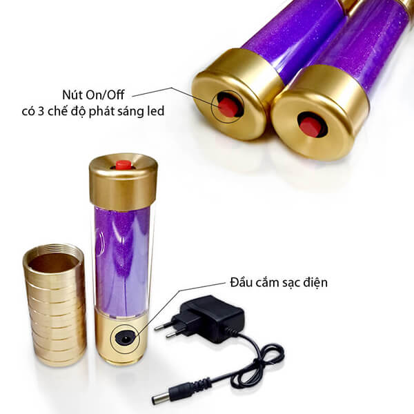 Thanh chụp đầu rượu trang trí led tím được làm từ chất liệu kim loại bền bỉ màu sắc sáng bóng, bên trong là bộ mạch điện tử có gắn dãy đèn led xung quanh phần thân của thanh chụp đầu rượu. Việc sử dụng đèn led phát sáng có dạ kim tuyến màu tím lấp lánh, chính là giải pháp tuyệt vời trong trang trí, bài trí không gian vừa tiết kệm chi phí vừa đạt hiệu quả cao... Sản phẩm có kèm theo đầu cắm sạc điện trực tiếp 220V, tiện lợi và dễ dàng mang theo sử dụng bất cứ đâu.